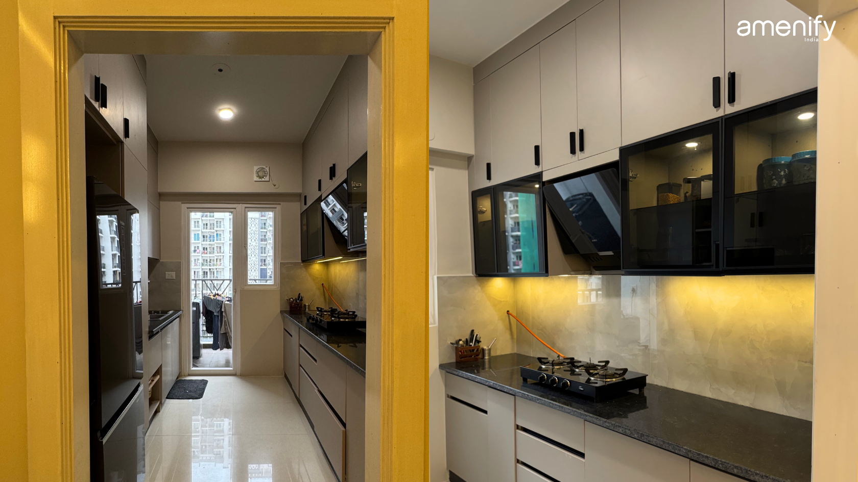 The kitchens here are efficient, but storage is often tight in a 3BHK. We focus on two things: Light and Height.