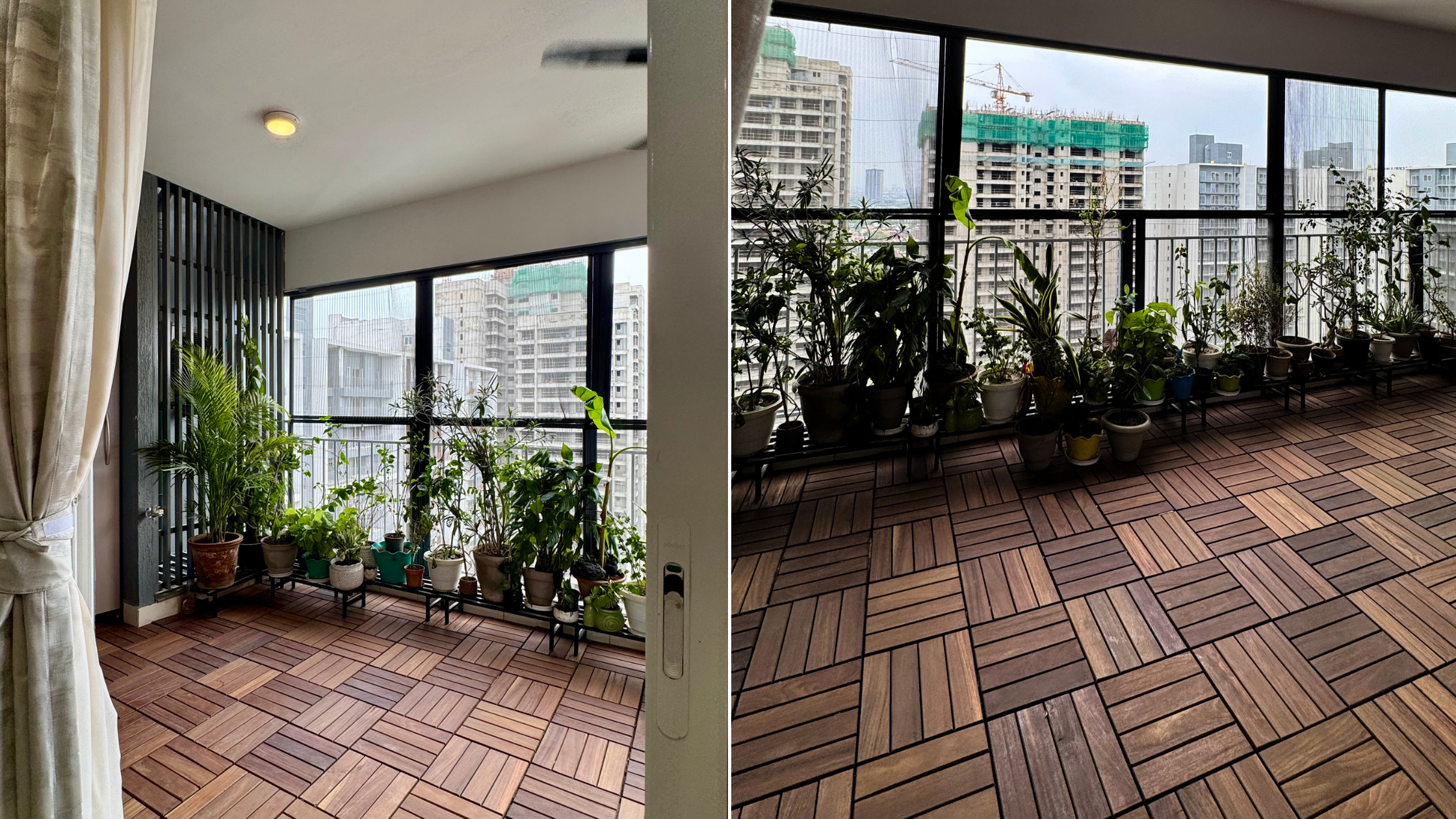 We treated this space as a “Coffee Deck.” We ripped out the standard builder tiles and installed WPC decking. It looks exactly like wooden planks but is waterproof and durable. We added a dedicated spot for a swing and installed warm cove lights for the evening. Now, instead of just being a place to dry clothes, it’s where the family starts their day.