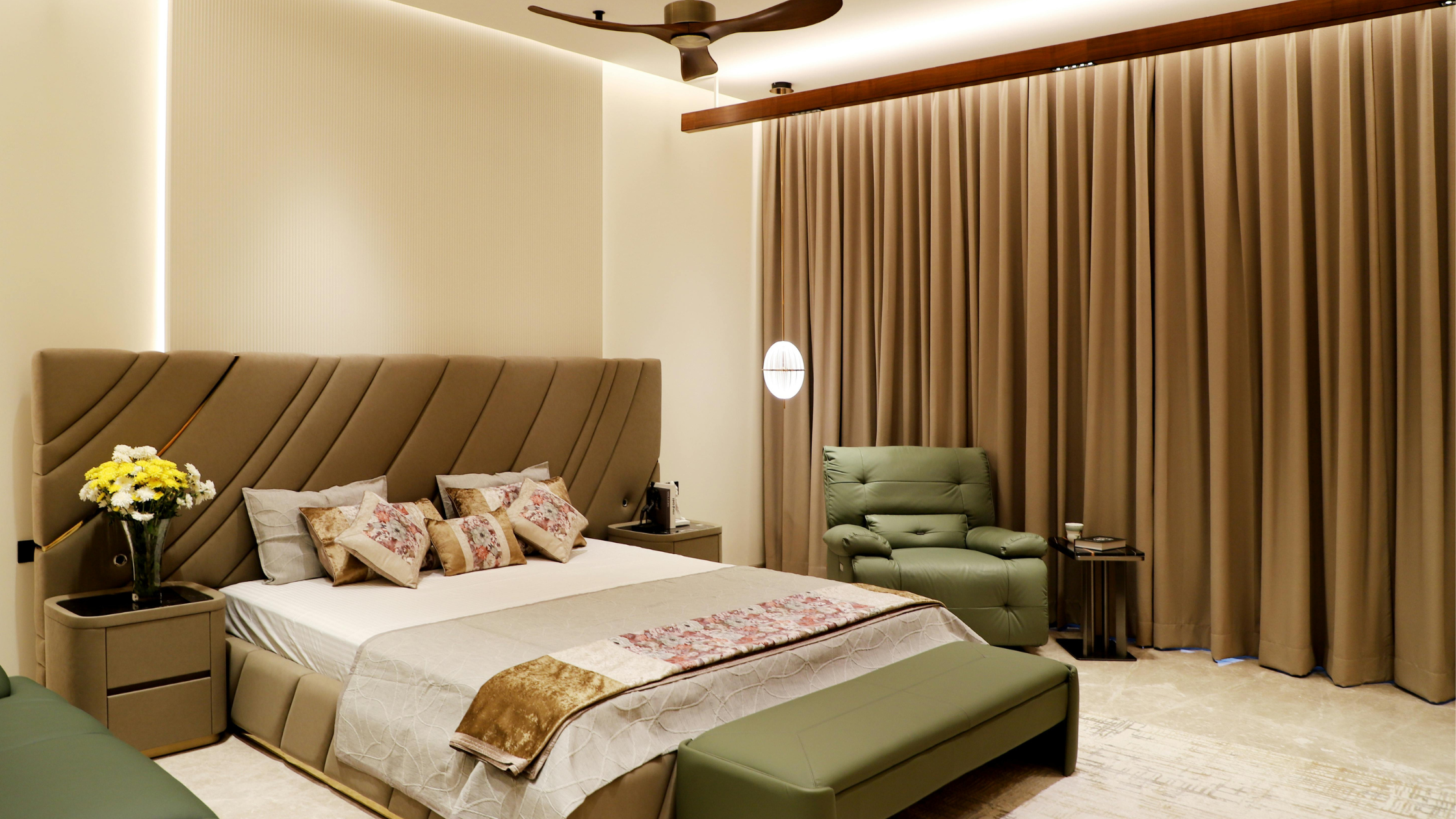 We focused on Texture over Bling. We avoided sharp edges and heavy furniture. The wardrobes are finished in a fabric-textured laminate that feels soft to the touch and doesn’t reflect glare. For the bed back, we used a subtle, patterned wallpaper in earth tones rather than heavy paneling. It makes the room feel cozy and calm—exactly what you need after a long drive back from Delhi.