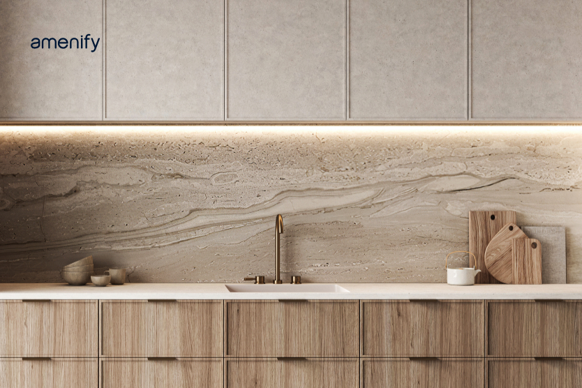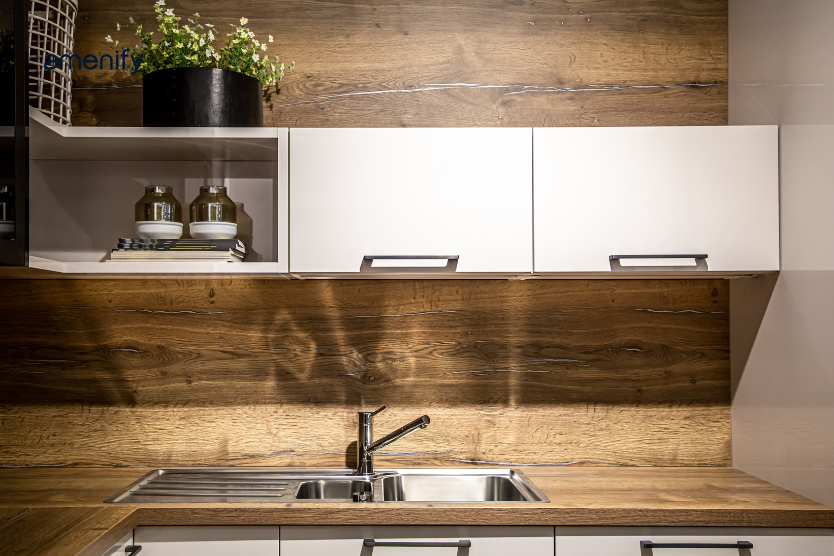 Sunmica is increasingly used as a backsplash alternative in modern kitchens. It creates a seamless look and is easier to wipe clean compared to tiled backsplashes. This works best with simple, neutral tones.