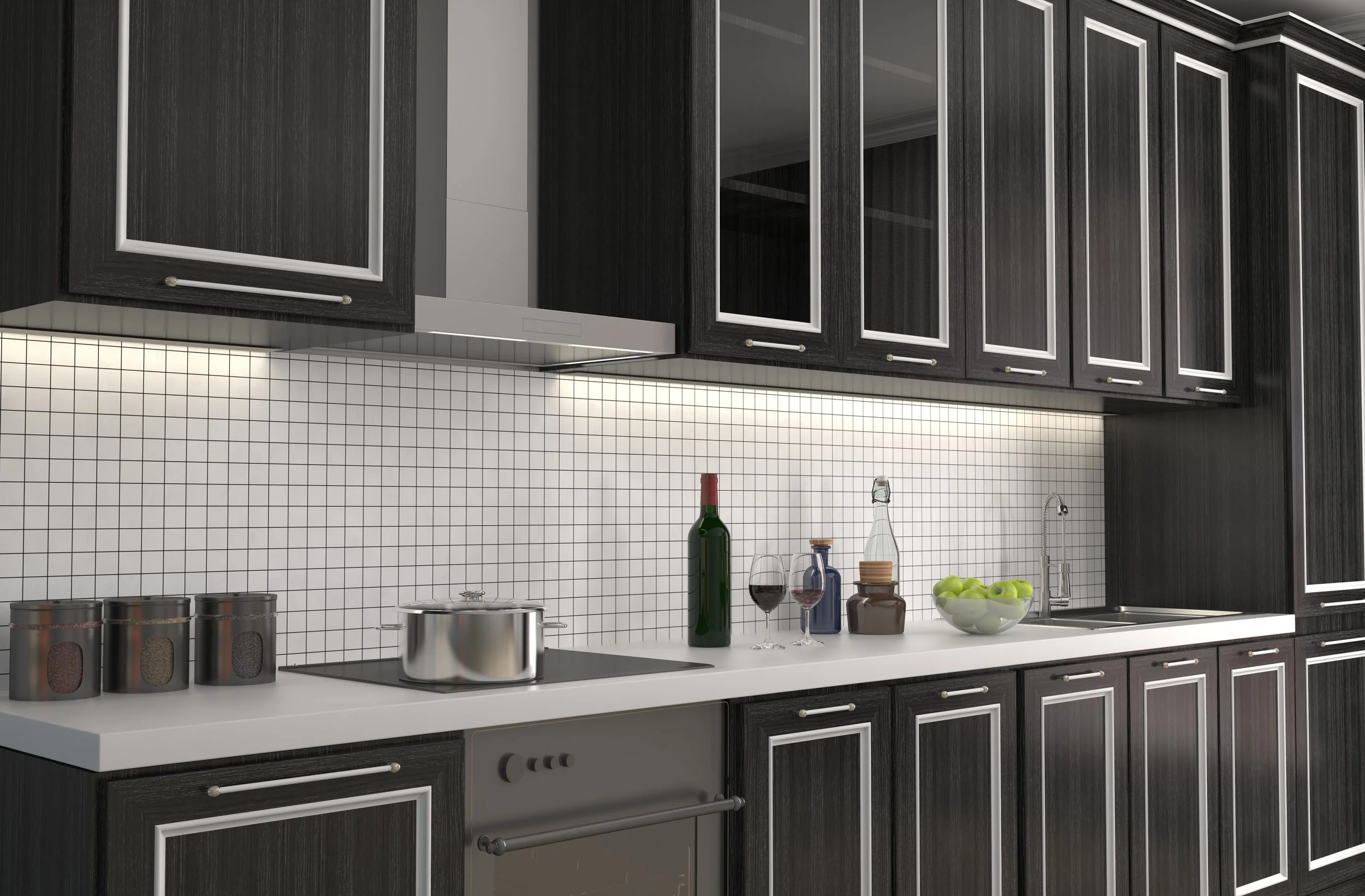 By using tile to create a continuous surface from the countertop through to the cabinets, the result is a smooth and contemporary wall. The continuous wall creates a more visually appealing look in the kitchen, giving the perception of a taller and wider area in a smaller kitchen. Further, the tile creates an overall barrier between the cabinets and wall to help protect against damage caused by food spills, oil splashes, and steam.